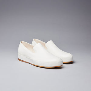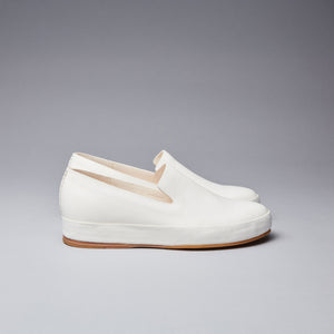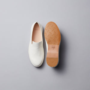 A modern interpretation of a classic shoe, this handsewn slip on is crafted entirely by hand from a single piece of vegetable tanned leather. Raw, unlined edges emphasize the purity of natural materials and showcase the human craftsmanship behind every pair. The leather retains a neutral and odor free quality in any environment and can be worn barefoot. We encourage you to do so after several initial wears.